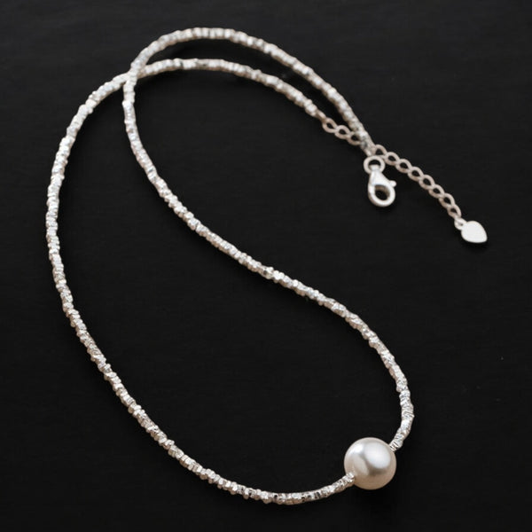 A timeless silver beaded chain with a single freshwater pearl centerpiece