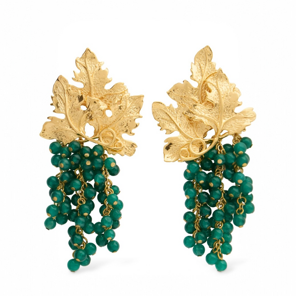 Inspired by nature’s opulence, these striking earrings feature intricately crafted golden vine leaves adorned with cascading clusters of deep green beads