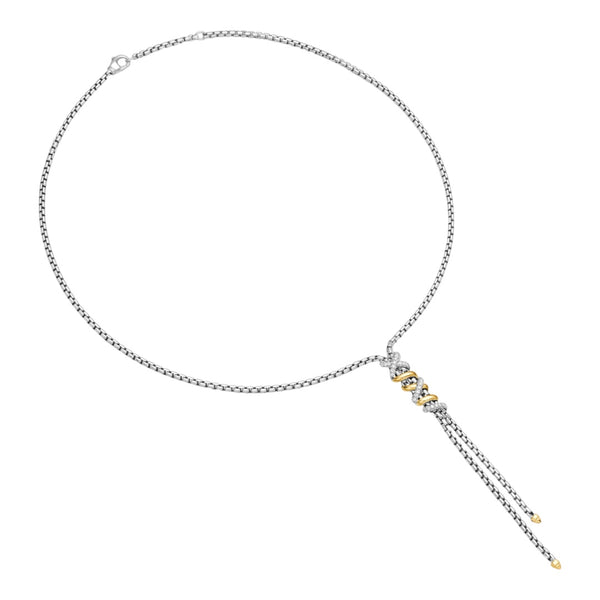 A chic silver-tone chain necklace featuring a knot detail with sparkling accents and cascading tassel drops.