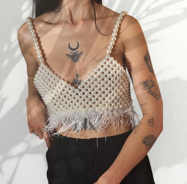 A statement crop top crafted from layered pearls with feather trim, blending elegance and bold style.