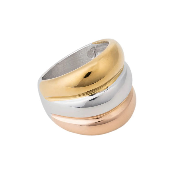 Chunky stainless steel ring featuring gold, silver, and rose gold tones for a bold, modern statement.
